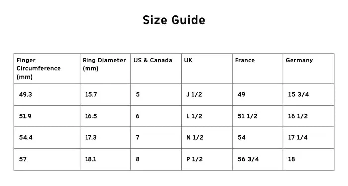 Use the ring size chart* to find your ring size based on the circumference. If your measurement falls between two sizes, we recommend choosing the larger size for a more comfortable fit.