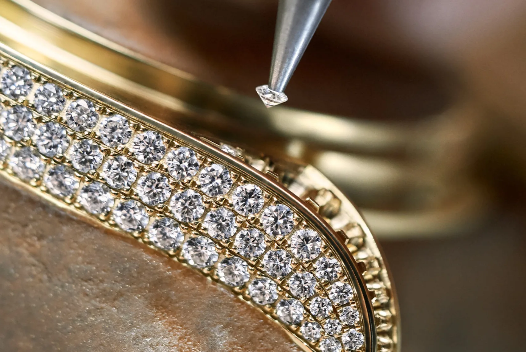 This technique involves setting many tiny diamonds closely together, held by microscopic beads of metal. It creates the appearance of a surface "paved" with diamonds.