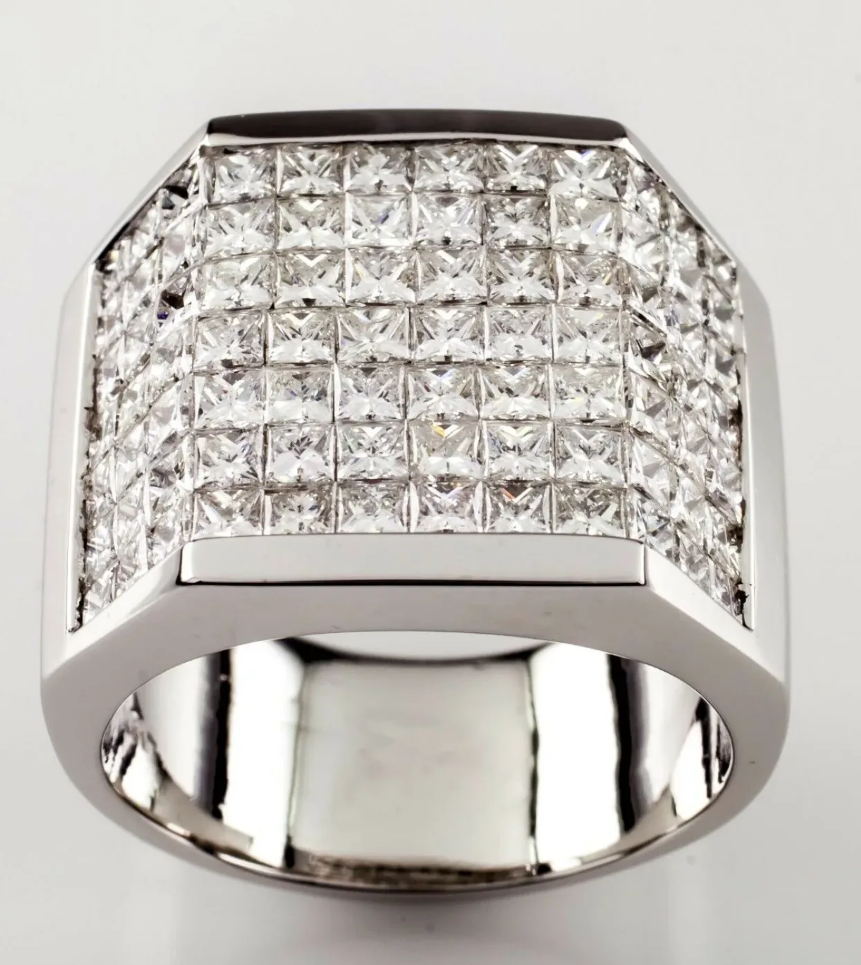 A highly complex technique where stones are set side-by-side with no visible metal holding them from the top. The stones (usually square or rectangular princess/emerald cuts) are grooved just below the girdle and snapped into a hidden metal grid underneath.